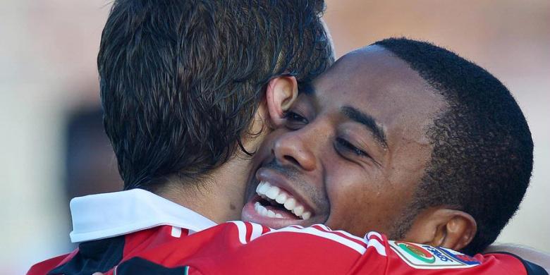 AC Milan, Robinho (kanan), ikut merayakan keberhasilan rekannya,